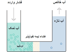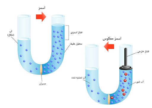 فکر کنید که یک لیوان آب نمک و لیوان یا ظرف دیگری دارای اب خالص است و این ها توسط یک لوله به یکدیگر متصل شده اند و هر دو دارای ارتفاع مساوی از آب و در یک سطح قرار داشته باشند. برای  برقراری تعادل در غلظت یون‌های سدیم و کلراید از ظرف آب نمک، یون‌های نمک به صورت نفوذ ملکولی وارد آب خبلص میشود  تا یک تعادل بین هردو آب برقرار شود اما اگر بین این دوظرف که یک اب خالص و دیگری آب ناخالص است یک غشا نیمه ترا وا قرار بگیرد  که فقط اجازه دهد مولکول‌های آب از آن عبور کنند، یون‌های نمک اجازه عبور نخواهند داشت؛زیرا برای برقراری تعادل در غلظت، آب خالص از ظرف شماره (۲) به ظرف شماره (۱) انتقال می‌یابد و این عمل تا آنجا ادامه می‌یابد که  اجازه انتقال آب از ظرف شماره (۲) به ظرف شماره (۱) را ندهدو به این ف۵شار فشار اسمزی گفته میشود  و غلظت نمک در هر دو طرف غشا میباشد